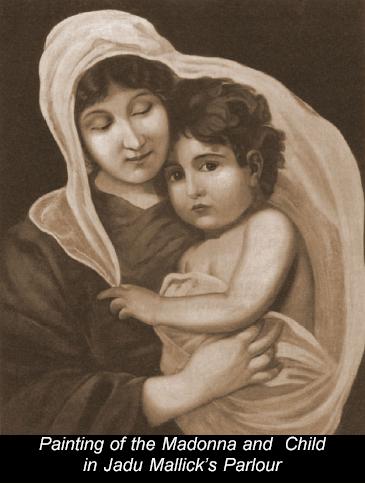 One day he was sitting in the parlour of another devotee, Jadu Mallick, also at Dakshineswar, when his eyes became fixed on a painting of Virgin Mary and Child. Watching it intently, he became gradually overwhelmed with divine emotion. The figures in the picture became life-like, and the rays of light emanating from them entered his soul.